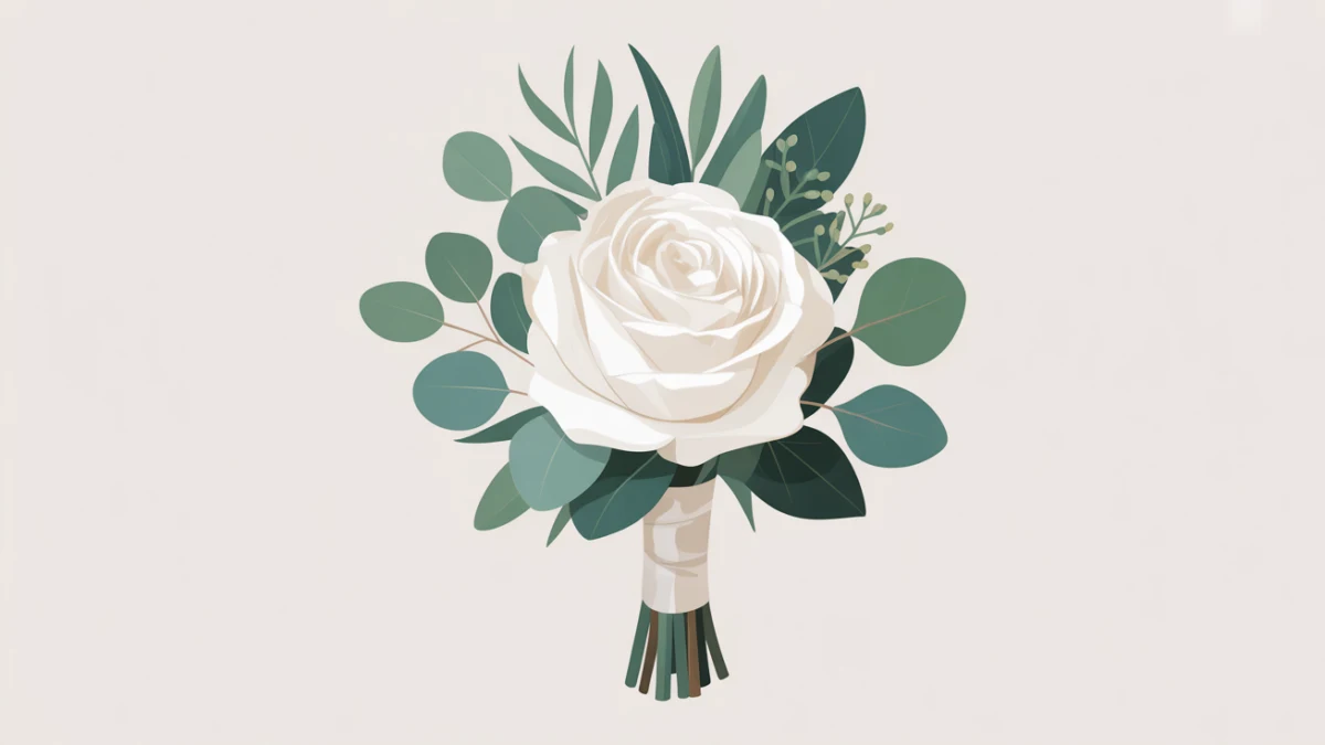 Белая или кремовая роза + веточка гипсофилы + белая атласная лента. Беспроигрышный вариант, который подойдет к любому букету невесты.