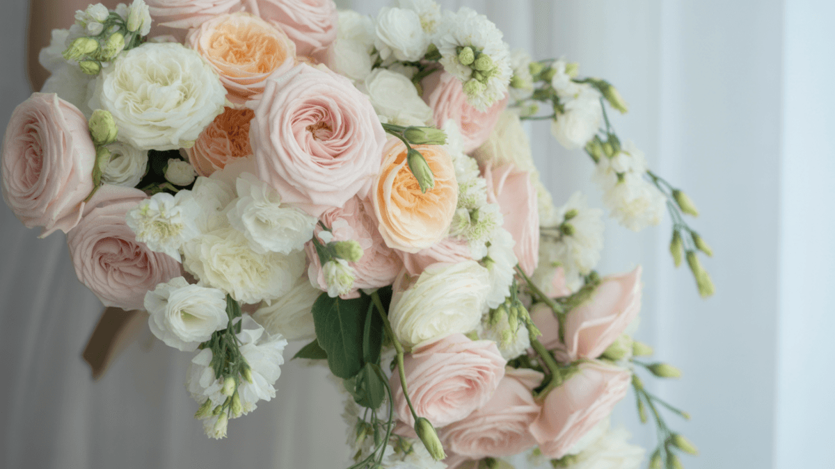 При создании каскадного букета важно учитывать цветовую гамму свадебного платья, время года и личный стиль невесты. В 2024 году предпочтение отдается нежным пастельным оттенкам с вкраплениями более насыщенных тонов.
